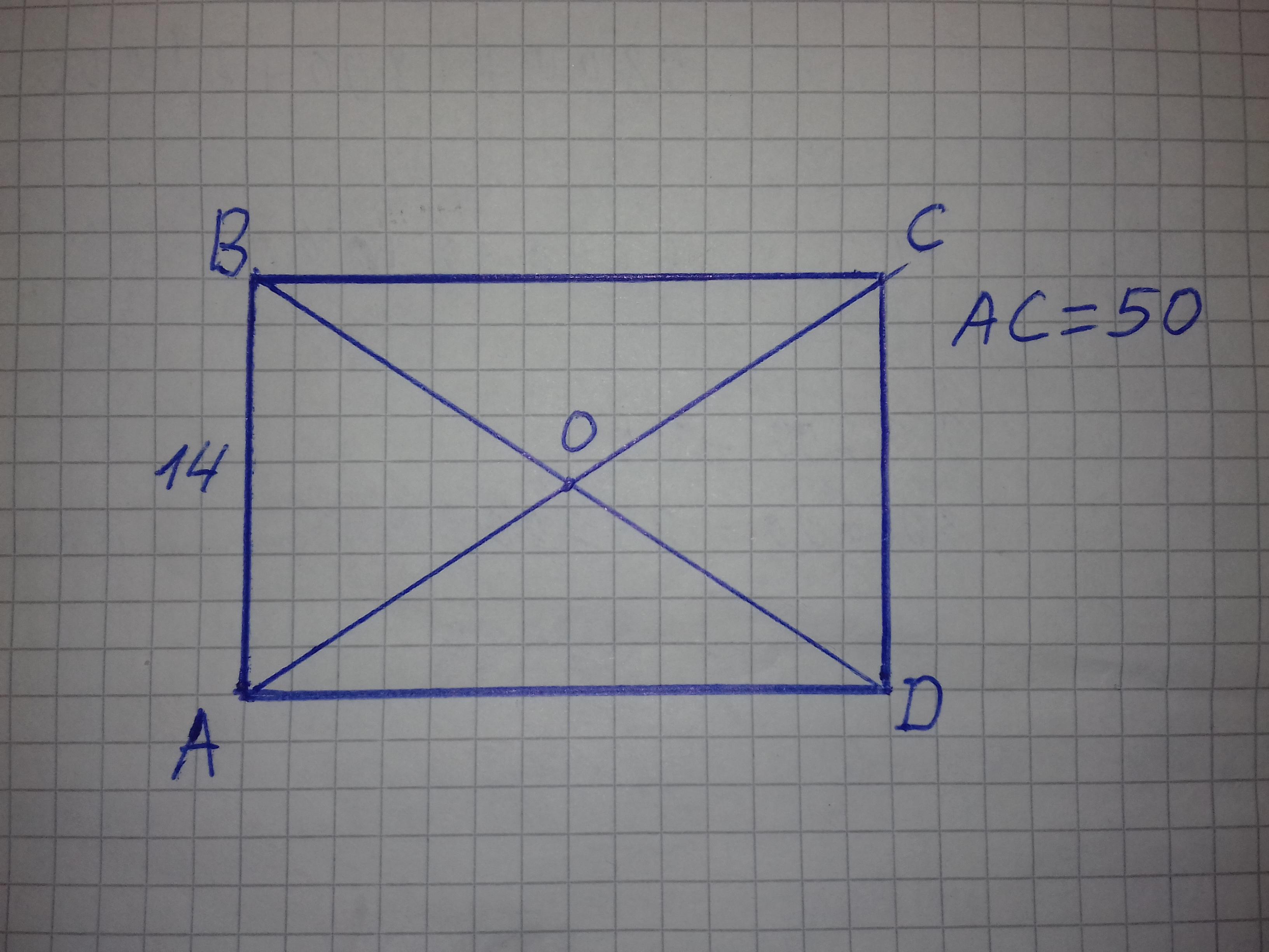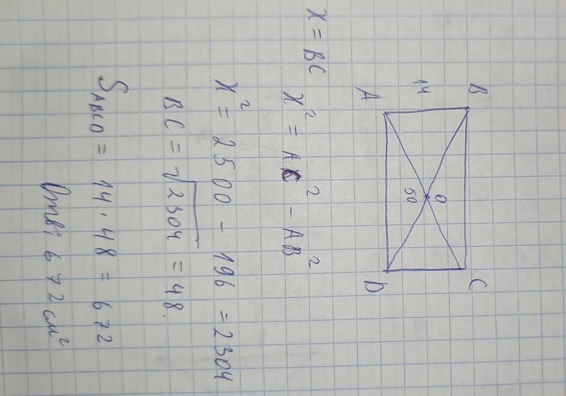 В прямоугольнике ABCD диагонали пересекаются в точке О. Найдите площадь прямоугольника, если, AC = 50 см, AB = 14 см.