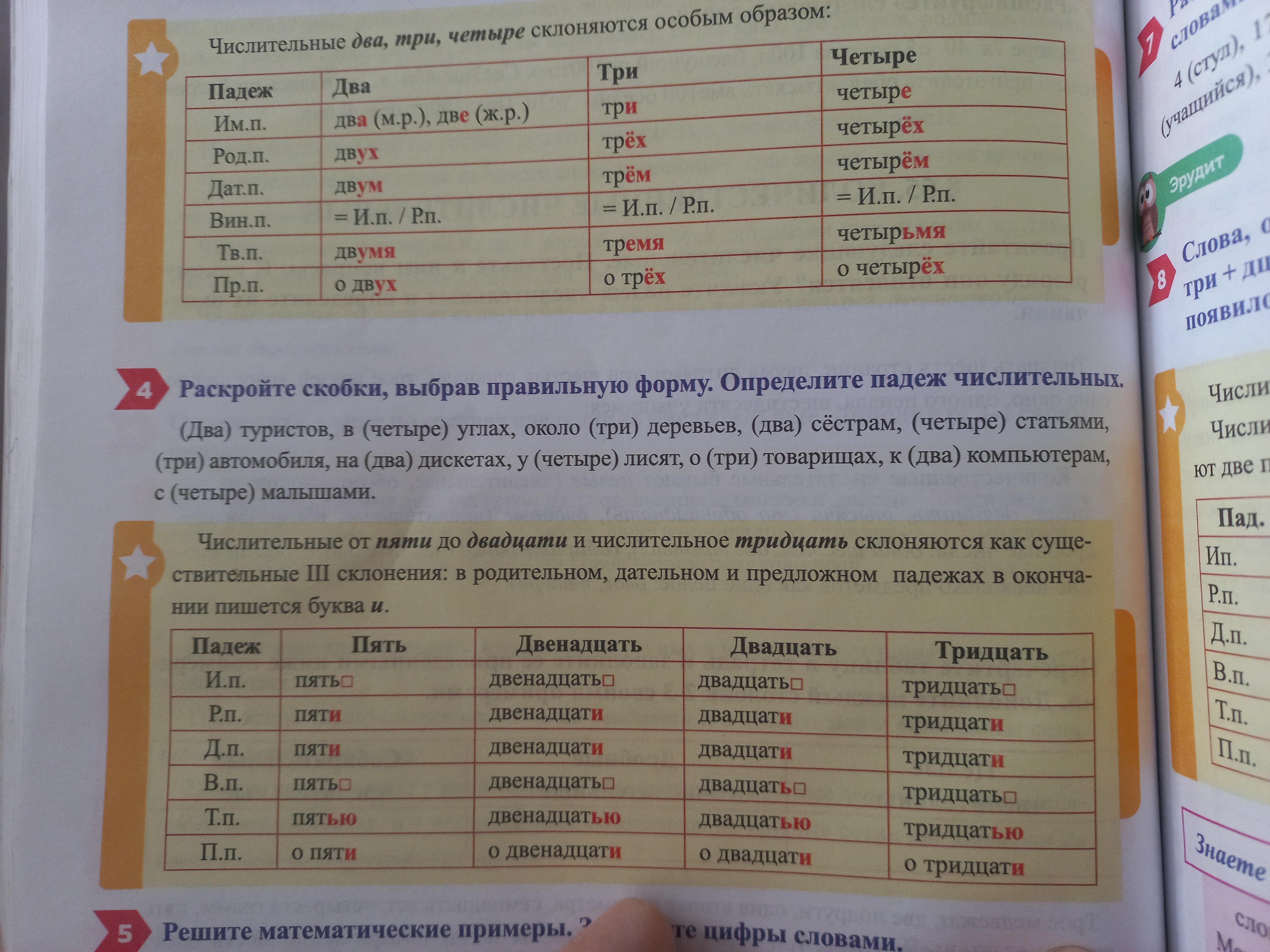 Двое туристов,в четырёх углах,около трёх деревьев,двум сёстрам,четырьмя статьями,три автомобиля,на двух дискетах,у четырёх лисят,о трёх товарищах,к двум компьютерам,с четырьмя малышами.