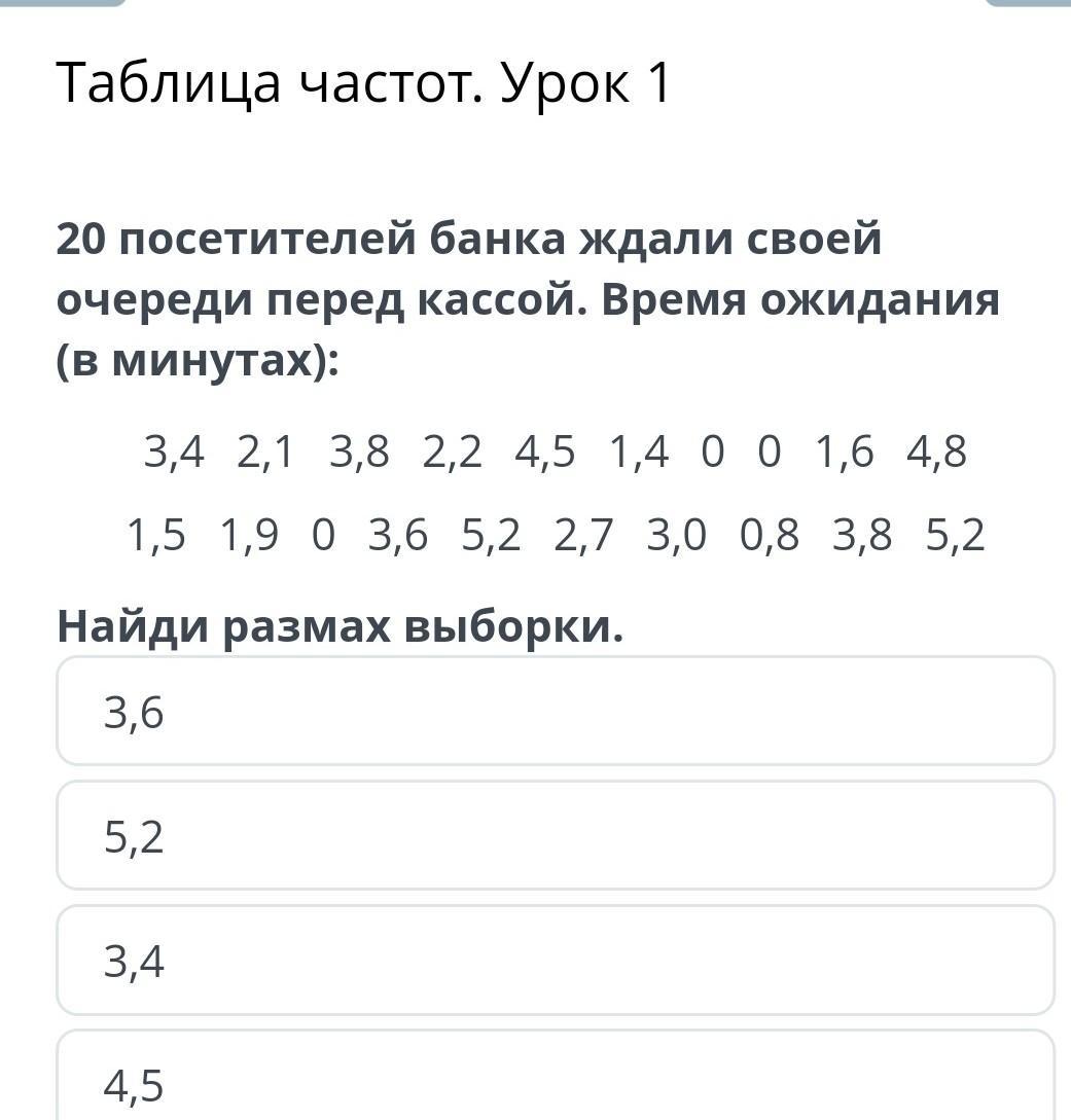 20 посетителей банка ждали своей очереди перед кассой. Время ожидания (в минутах):
