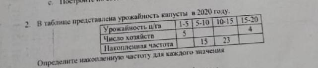 2. В таблице представлена урожайность капусты =2020 года . Урожайность n / m 1-5 5-10 10-15 15-20 Число хозяйств часто 5 4 15 23 Определите накопленную частоту для каждого человека