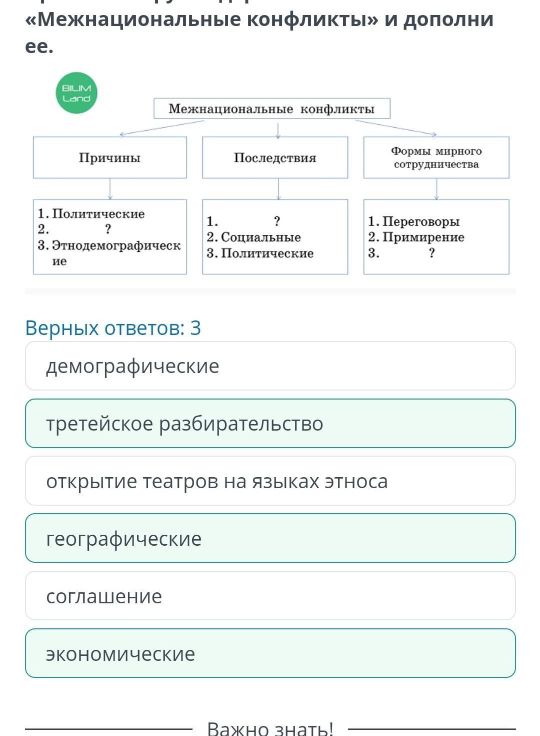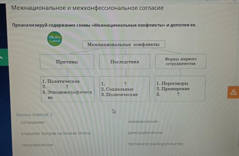 Межнациональное и межконфессиональное согласие Проанализируй содержание схемы «Межнациональные конфликты» и дополни ее. BIUM Land межнациональные конфликты Причины Последствия Формы мирного сотрудничества 1. Политические 2. ? 3. Этнодемографическ 1. ? 2. Социальные 3. Политические 1. Переговоры 2. Примирение 3. w ие Верных ответов: 3 соглашение Экономические открытие театров на языках этноса демографические географические третейское разбирательство