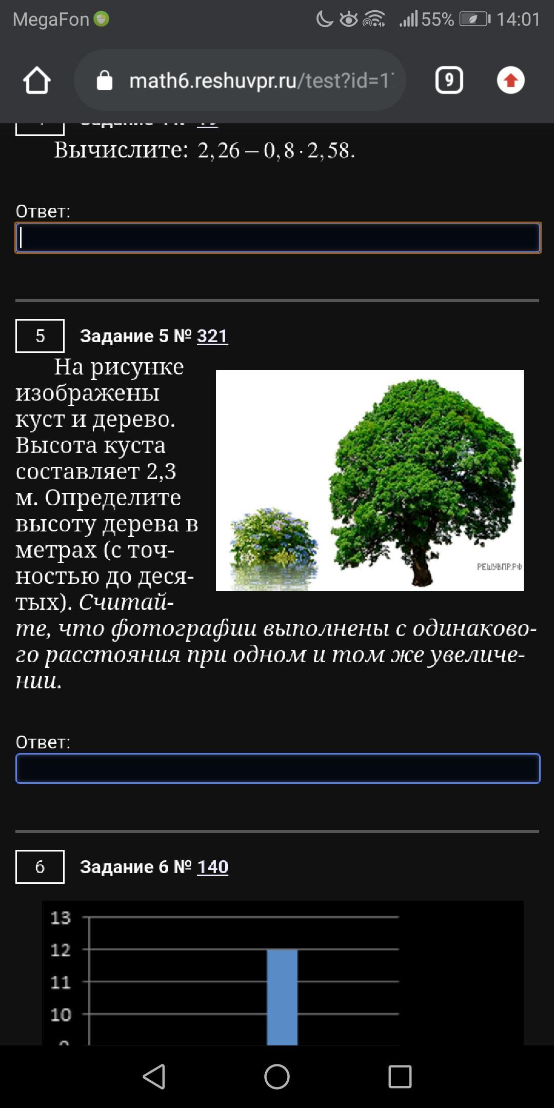 На рисунке изображены куст и дерево. Высота куста составляет 2,3 м. Определите высоту дерева в метрах (с точностью до десятых). Считайте, что фотографии выполнены с одинакового расстояния при одном и том же увеличении.