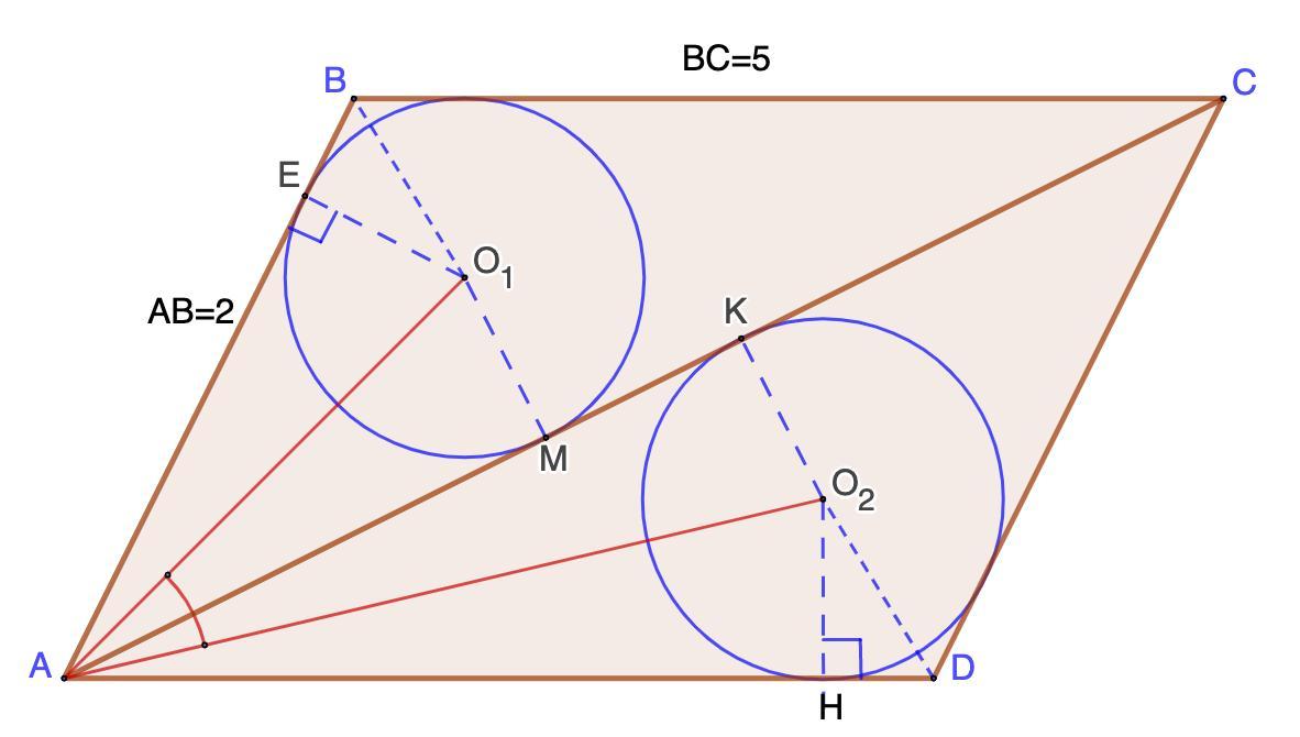в) Дан параллелограмм `ABCD`, в котором `AB=2`, `BC=5` и $$\angle ABC={108}^{\circ }$$ ). В треугольник `ABC` вписана окружность с центром `O_1`, касающаяся диагонали `AC` в точке `M`, а в треугольник `ACD` вписана окружность с центром `O_2`, касающаяся диагонали `AC` в точке `K`. Чему равны длина отрезка `MK` и величина угла `O_1AO_2`
