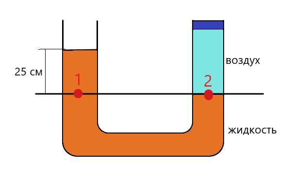 В точке 1 давление будет состоять из атмосферного давления и давления столба жидкости высотой 25 см: р₁=р₀+р.