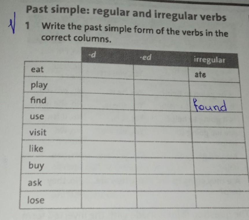 Past simple: regular and irregular verbs 1 Write the past simple form of the verbs in the correct columns.
