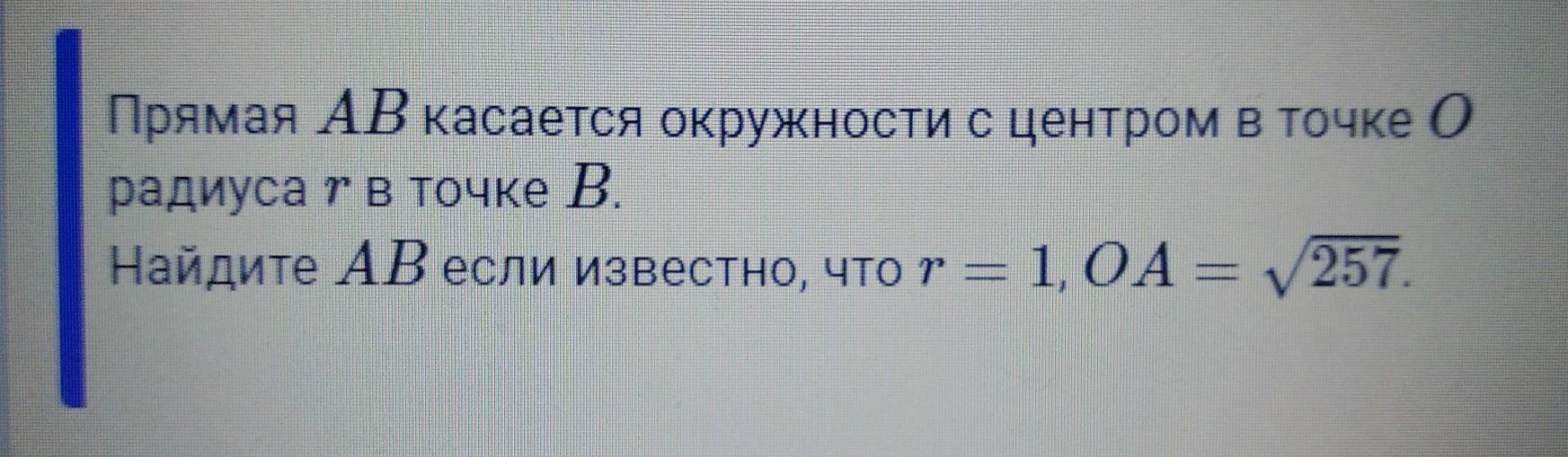 АВ =√( ОА² - ОВ² ) = √[ ( √257 )² - 1² ] = √(257 - 1 ) = √256 = 16 ;