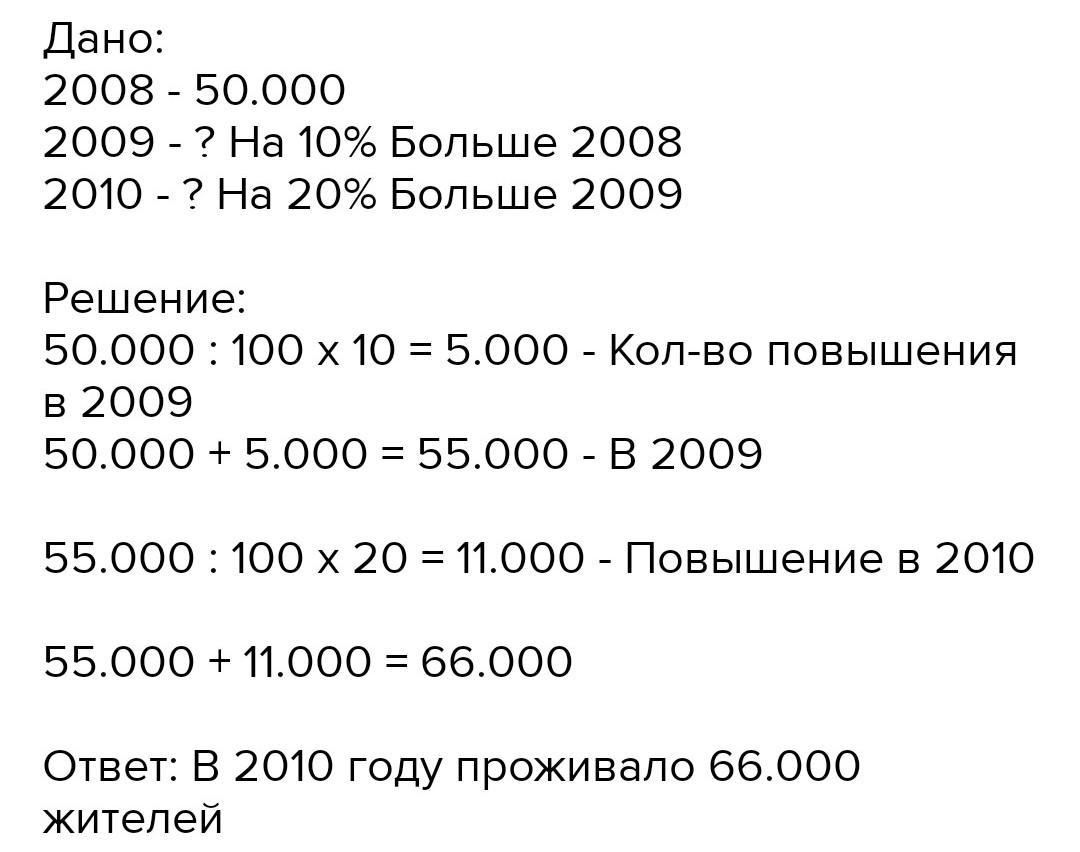 В 2008 году в городском квартале проживало 50 000 человек. В 2009 году, в результате строительства новых домов, число жителей выросло на 7%, а в 2010 году — на 13% по сравнению с 2009 годом. Сколько человек стало проживать в квартале в 2010 году?
