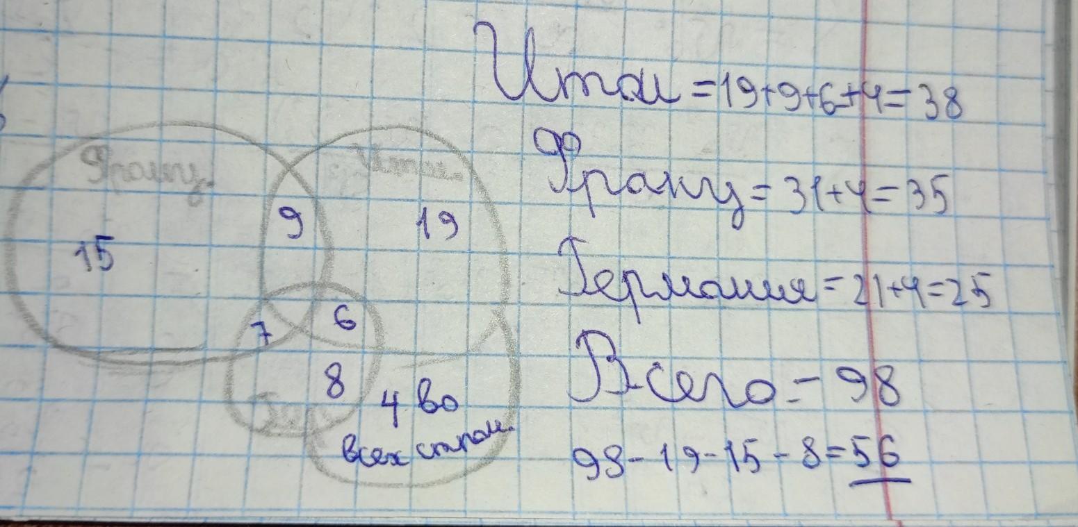 Оказалось, что в группе туристов 15 человек были раньше во Франции, 19 - в Италии, 8 - в Германии, 9 туристов были во Франции и в Италии, 7 - Во Франции и в Германии, 6 - и в Италии, и в Германии. 4 туриста были во всех трех странах. Сколько туристов были хотя бы в одной из трех стран? (ответ с решением)