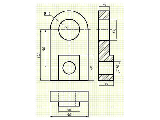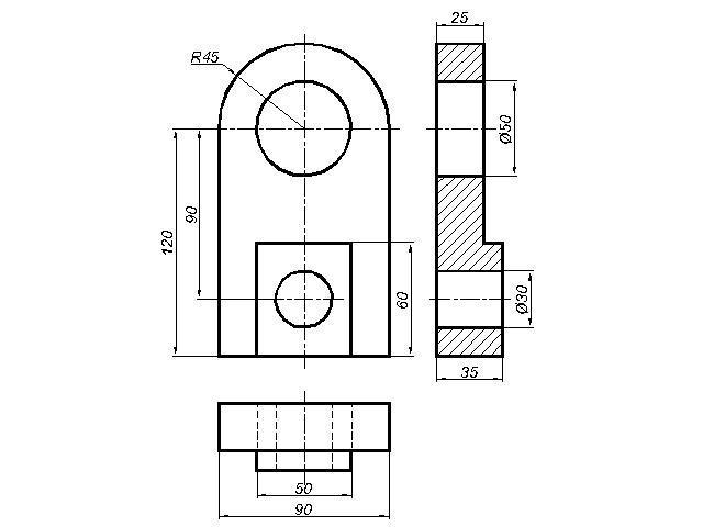 Для первой детали выполнила профильный разрез. Для этой детали достаточно начертить два вида (спереди и профильный разрез), а вид сверху не несет никакой информации. Размеры, указанные на виде сверху можно перенести на вид спереди (главный вид).