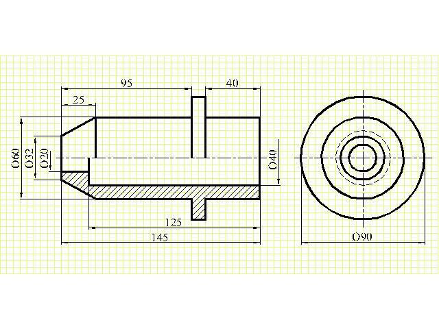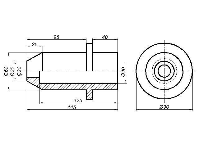 Для второй детали вид спереди выполнила, как 1/2 вида + 1/2 фронтального разреза. Для многих деталей вращения достаточно начертить один главный вид, т.к., благодаря, условным обозначениям (диаметр) можно понять конструкцию детали по одному виду. Я начертила вид слева, на всякий случай, а вот вид сверху чертить не нужно, т.к. он повторяет главный вид, только без разреза.