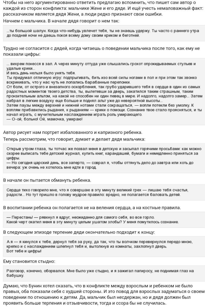 автор на стороне дяди и ему жаль Женю, но чтобы не воспитать балованного ребёнку, ему предписано было учиться терпению. Очень трогательно описаны мучения взрослых, чтлбы воспитательный процесс удался и ребёнок получил важный урок-не всё делается сразу.