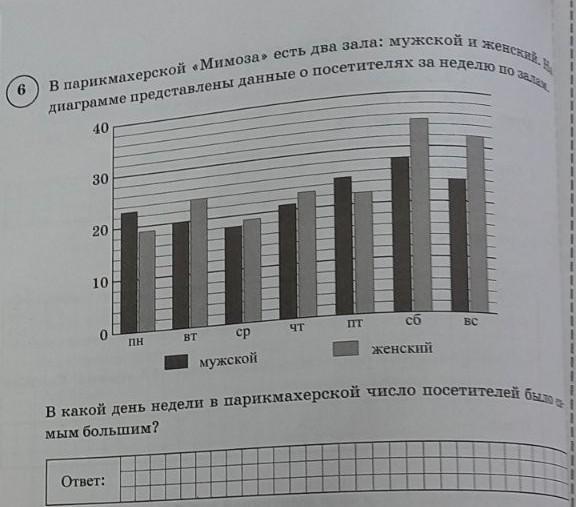 Ответ: в субботу. Нас спрашивали в какой день число посетителей было самым большим, взглянем на диаграмму и увидим, что в субботу было наибольшее число посетителей (как женщин, так и мужчин)