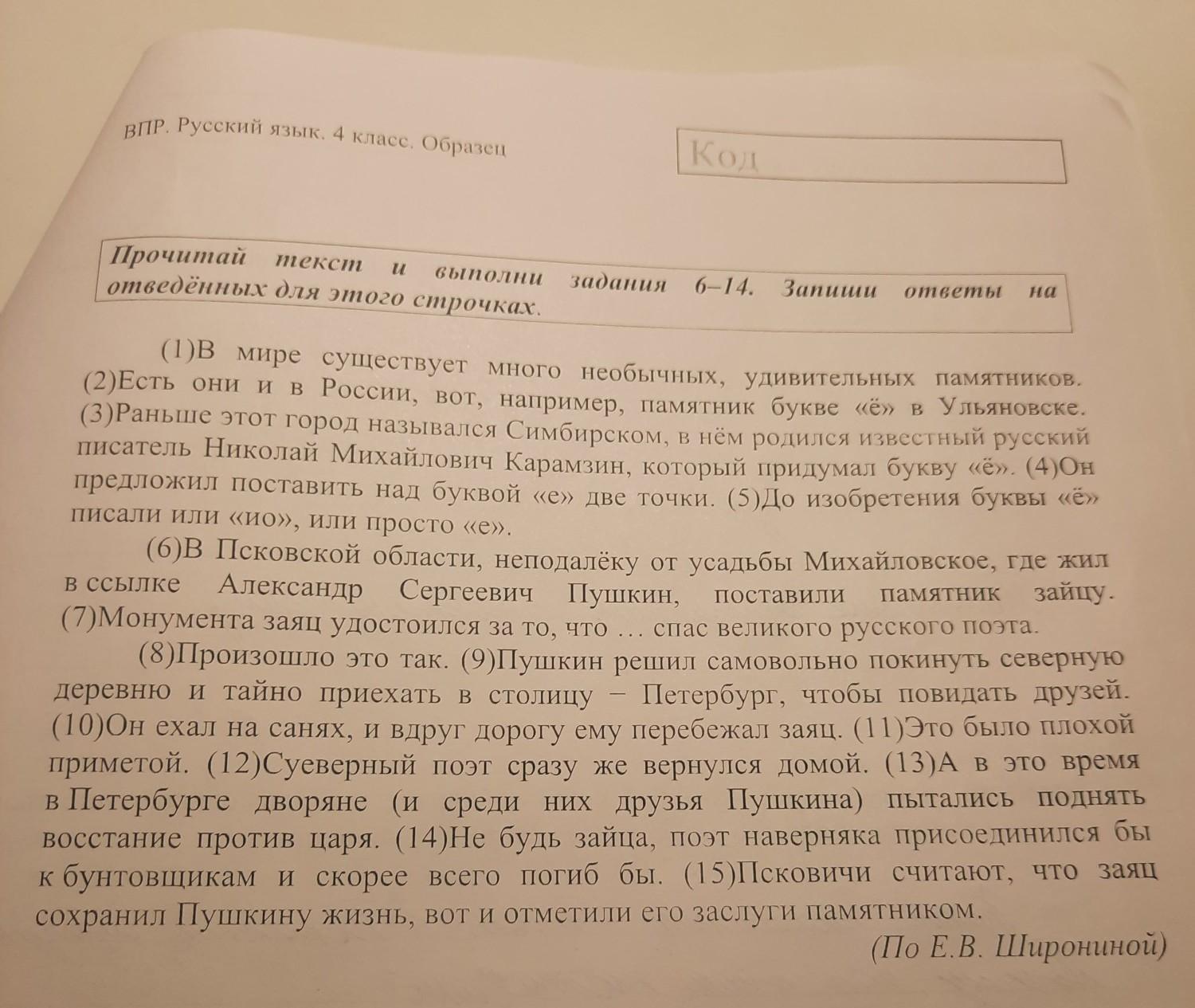 ВПР. Русский язык. 4 класс. Образец номер 10 Замени слово «известный» из 3-го предложения близким по значению словом. Запиши это слово. Ответ. Известный —
