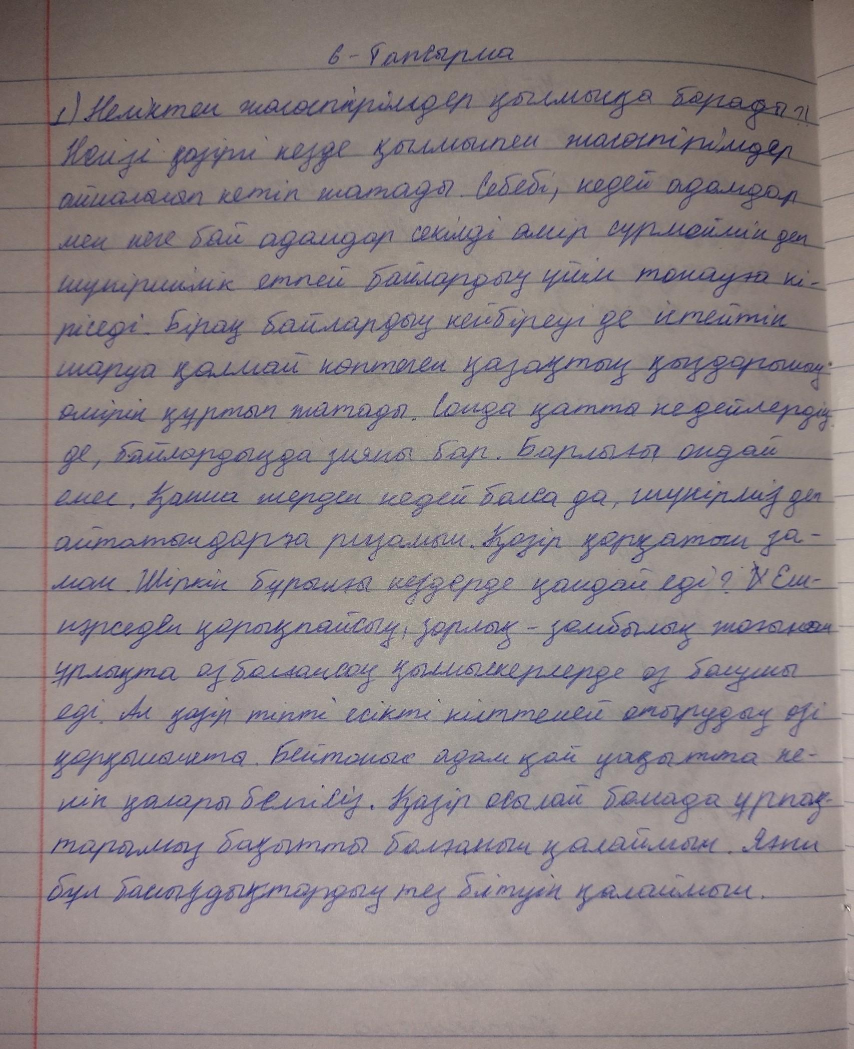 Екі тапсырманың бірін орындаңдар. 1. «Неліктен жасөспірімдер қылмысқа барады?» деген тақырып та әртүрлі жастағы бес адамнан кем дегенде үш сұрақтан тұра- тын сауалнама алыңдар. Сауалнаманың нәтижесін диаграмма- мен көрсетіңдер. 2. «Капитан Нұрхан Досұлының Сипаттамалық эссенің қылмыскерді құрықтауы» та- мақсаты - адамның, қырыбында ойдан шығарып, жердің, заттың бейнесін не- месе психологиялық ахуалды сипаттамалық эссе жазыңдар. оқырманға елестете отырып си- Сөз саны 150. Сөйлемдердің паттау. айтылу мақсатына қарай түр- лерін анықтаңдар.