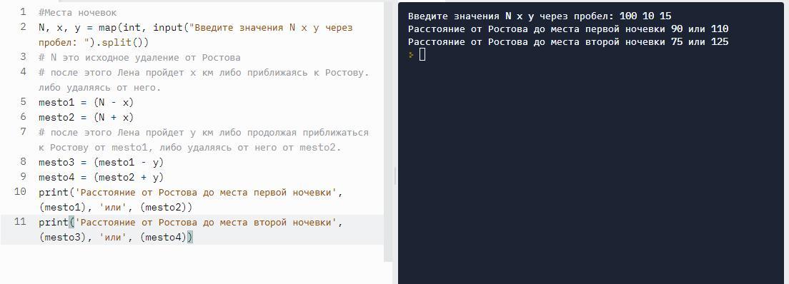 print('Расстояние от Ростова до места первой ночевки', (mesto1), 'или', (mesto2))