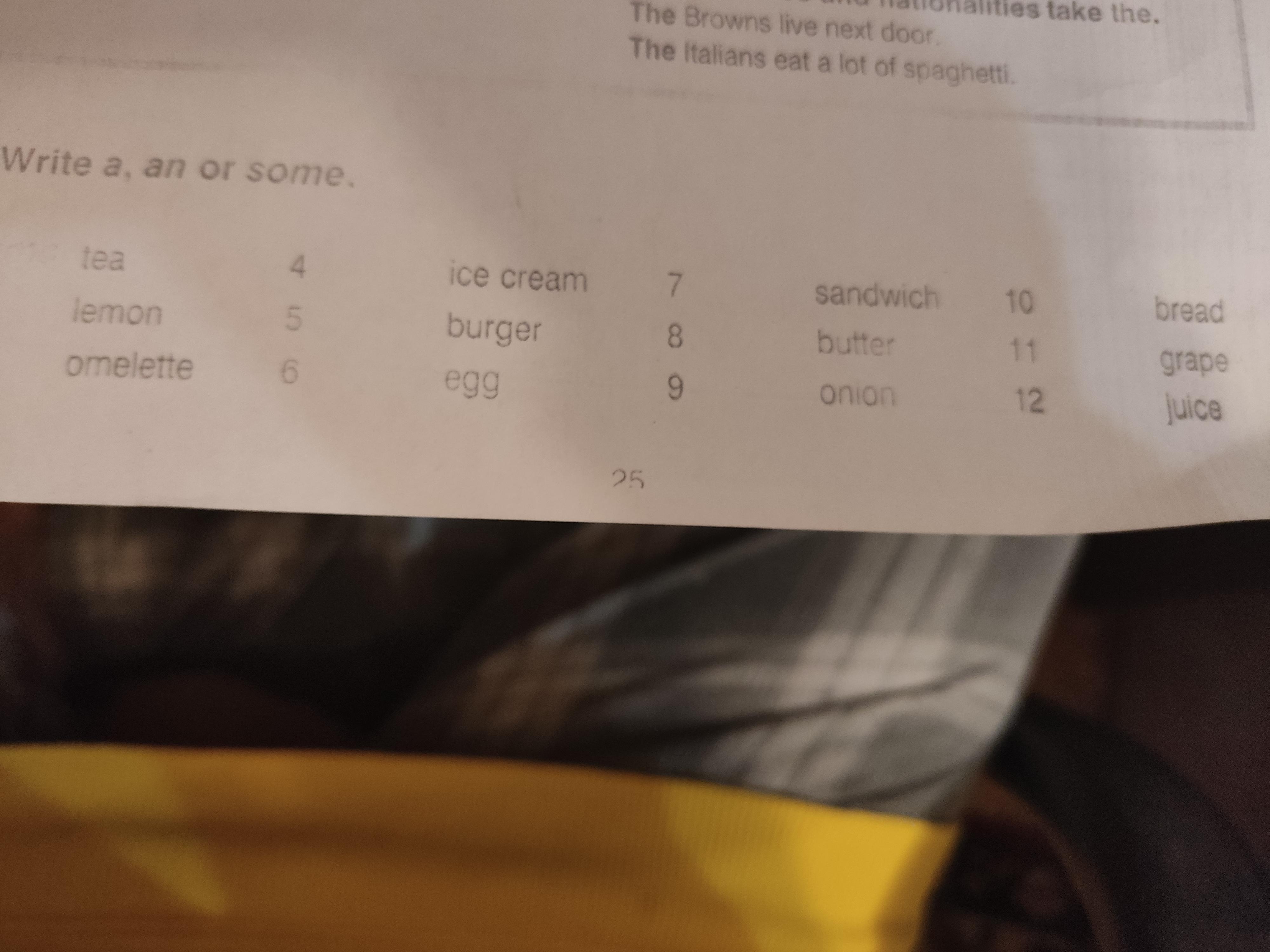 a tea a lemon an ice-cream a sandwich a bread an omelette a burger an egg some butter an onion a grape some juice