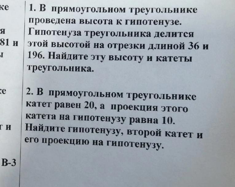 Вся "соль" подобных задач в том, что в прямоугольном треугольнике высота к гипотенузе делит его на два, подобных ему (то есть все три треугольника - два, на которые его режет высота, и сам треугольник, - подобны между собой). Вот скажем задача 2. Из упомянутого подобия сразу следует, что гипотенуза равна 40. У одного из ТРЕХ треугольников отношение катета к гипотенузе равно 1/2, значит, оно такое же и у всего треугольника.