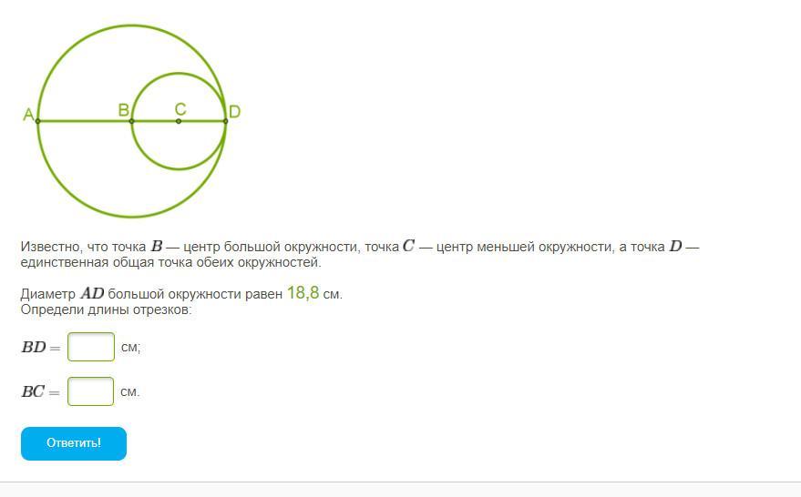 раз В-центр большей окружности, то ВD- ее радиус, который, ясно, что равен половине диаметра. т.е. 18.8/2=9.4 /см/