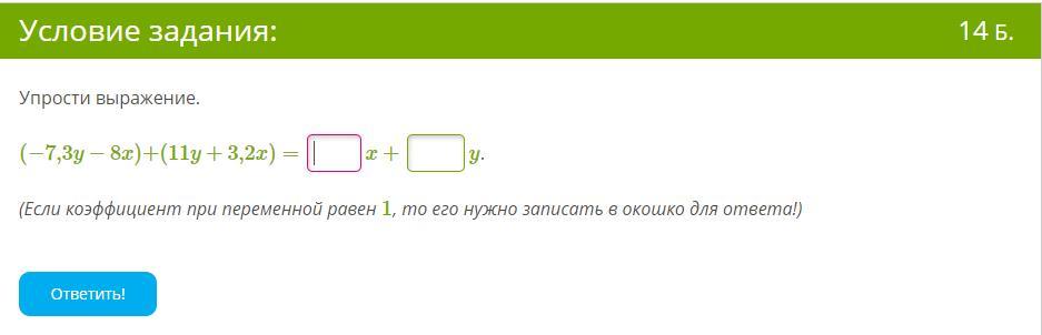 (-7,3у -8х) +(11у +3,2х)= -7,3у - 8х +11у +3,2х= 11у-7,3у -8х+3,2х= 3,7у -4,8х=