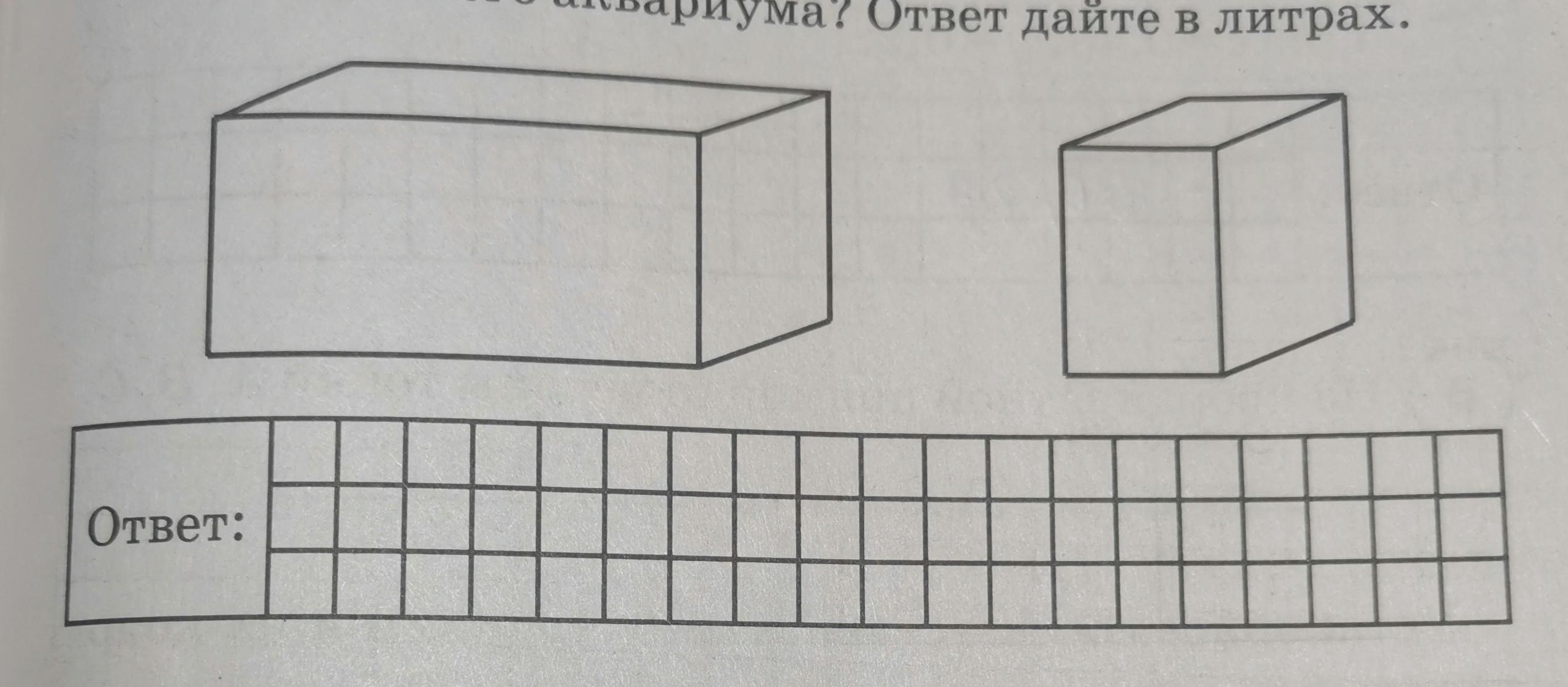 на рисунке изображены два аквариума, у которых высота и ширина одинаковые. объем одного аквариума равен 380 литрам. каков примерный объем меньшего аквариума? ответ дайте в литрах.