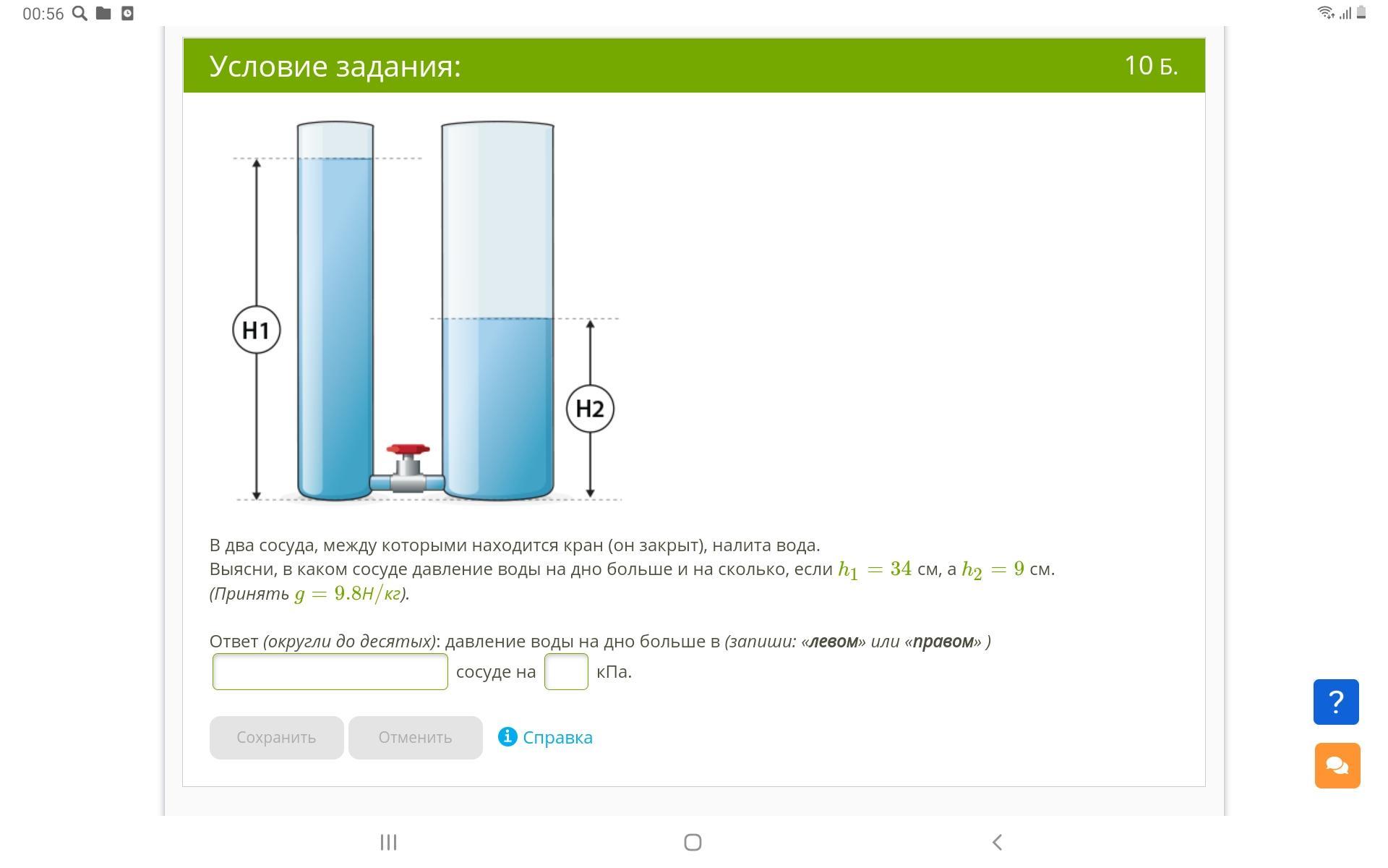 Ответ (округли до десятых): давление воды на дно больше в (запиши: «левом» или «правом» ) сосуде на кПа.