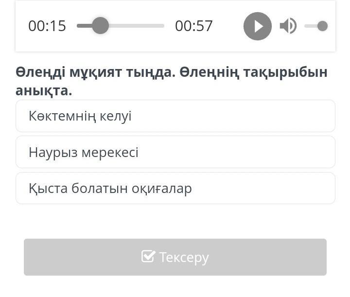 Мақатев «Наурыз» 00:00 00:57 Өлеңді мұқият тыңда. Өлеңнің тақырыбын анықта. Көктемнің келуі Наурыз мерекесі Қыста болатын оқиғалар