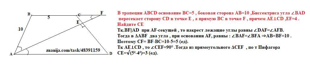 В трапеции АВСD основание ВС=5 , боковая сторона АВ=10 ,Биссектриса угла ∠ВАD пересекает сторону CD в точке Е , а прямую ВС в точке F , причем АЕ⊥СD ,EF=4 .Найдите СЕ