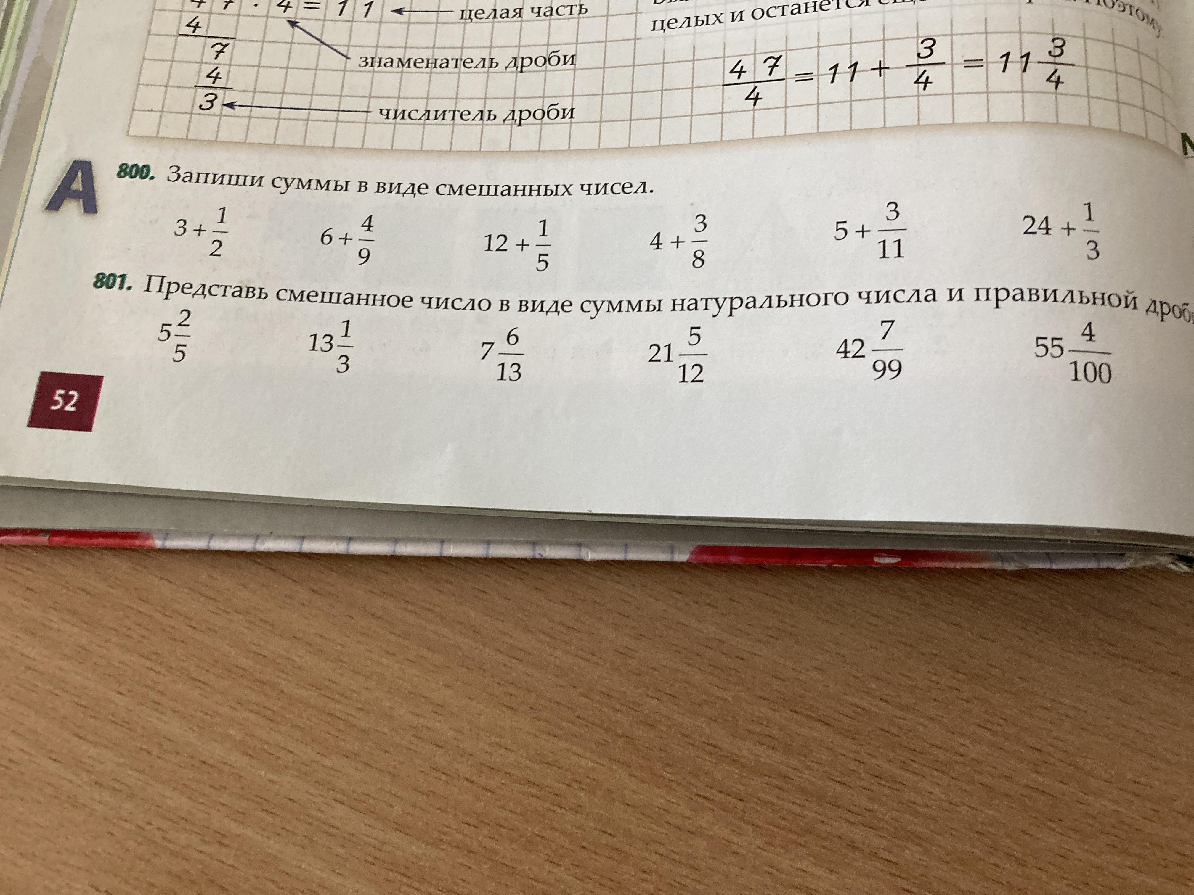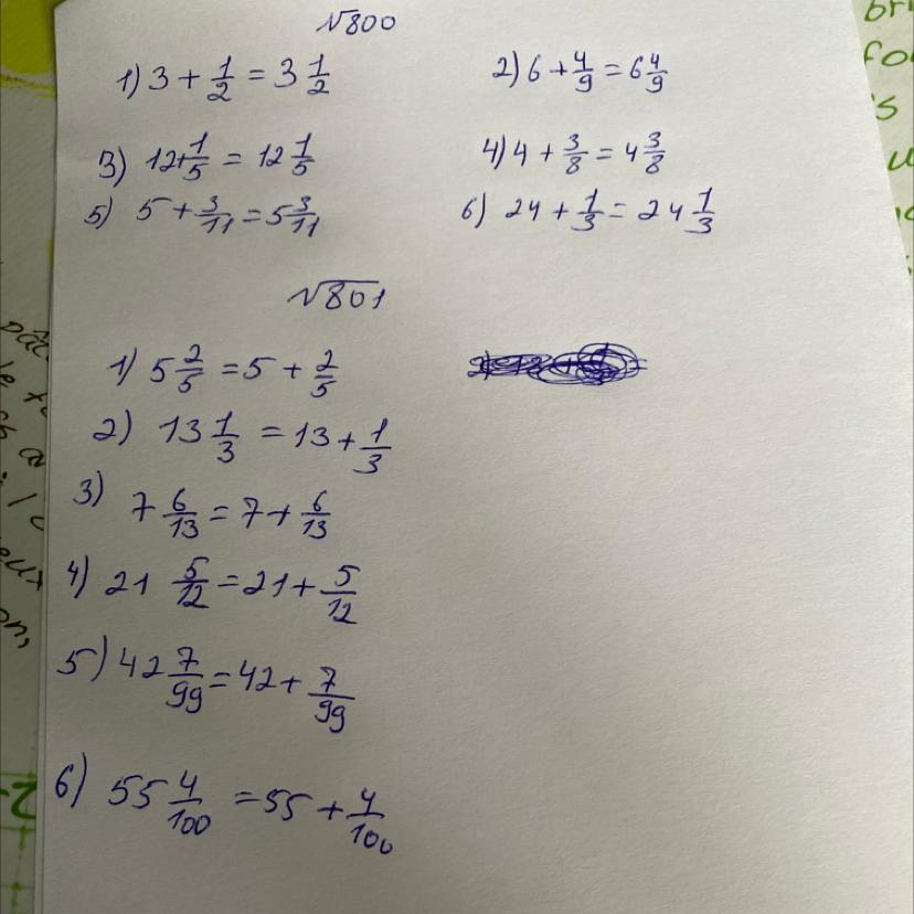 801. 5+2/5;13+1/3; 7+6/13; 21 +5/12; 42+7/99; 55+4/100