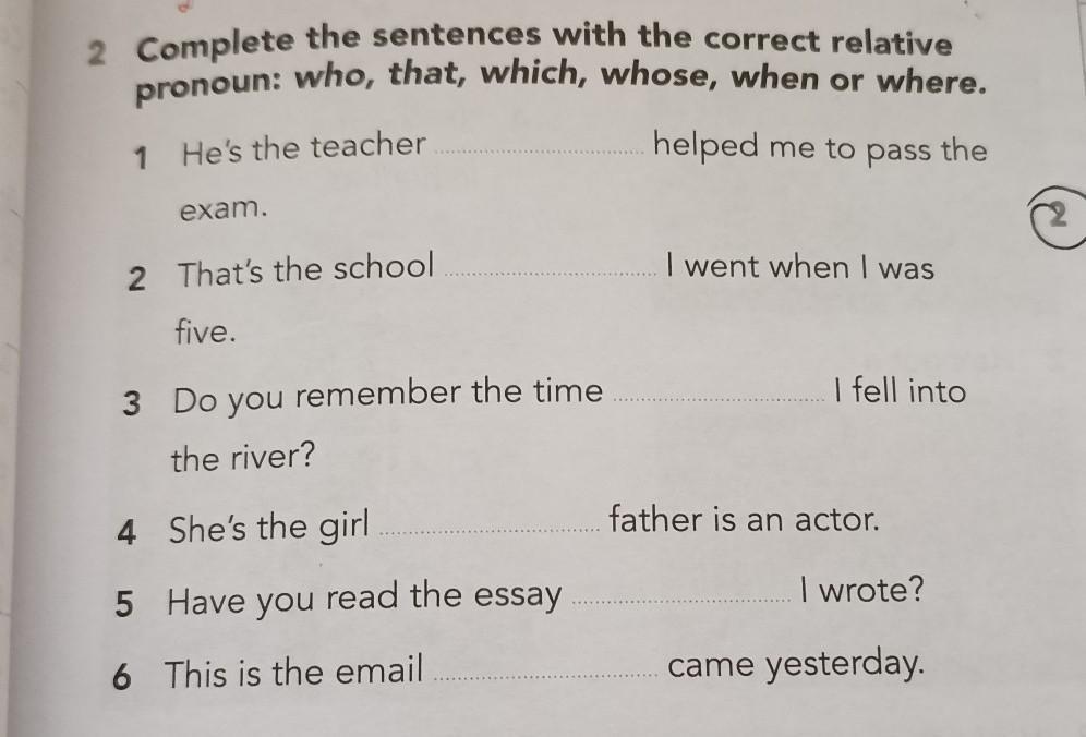 2 Complete the sentences with the correct relative pronoun: who, that, which, whose, when or where. helped me to pass the 1 He's the teacher exam. . 2 2 That's the school I went when I was five. I fell into 3 Do you remember the time the river? 4 She's the girl father is an actor. 5 Have you read the essay I wrote? 6 This is the email came yesterday