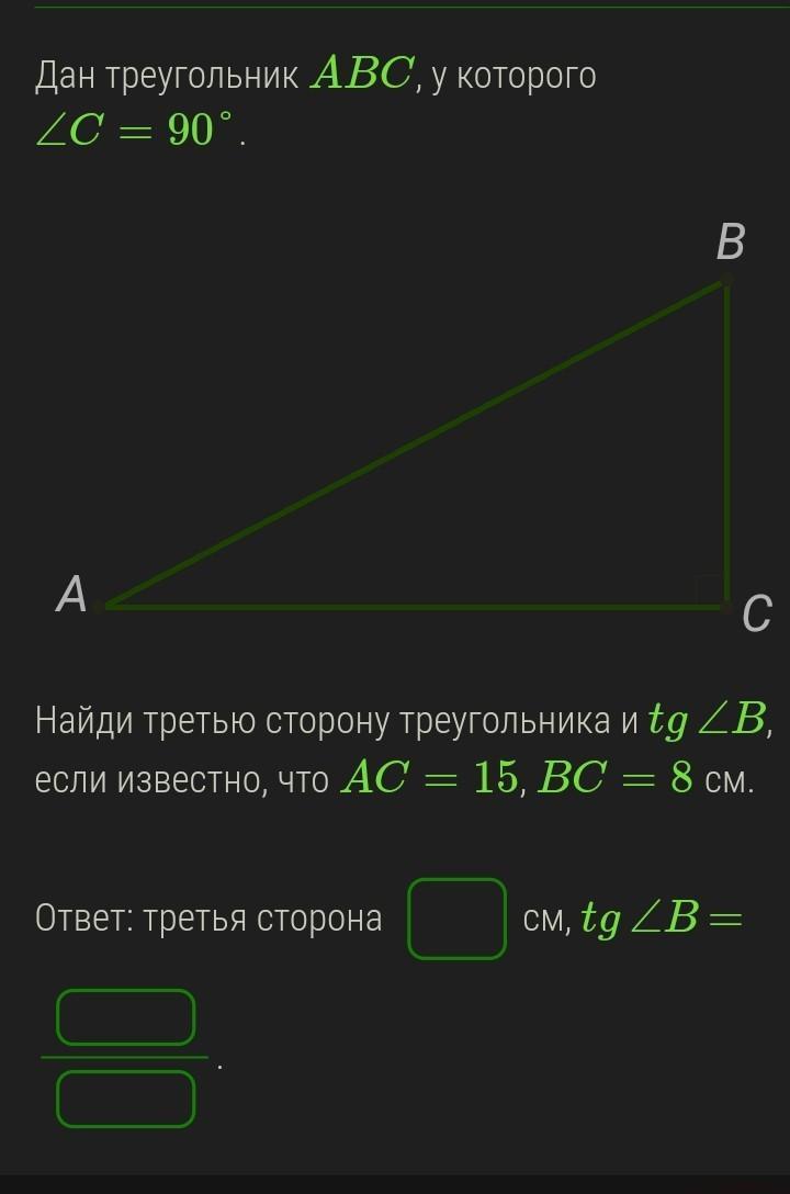 третья сторона равна 17, т.к. чтобы найти гипотенузу прям. треуг. воспользуемся формулой: c=a^2+b^2. подставляем и полуается 17. насчёт тангенса, то должно быть ответом является 8/15