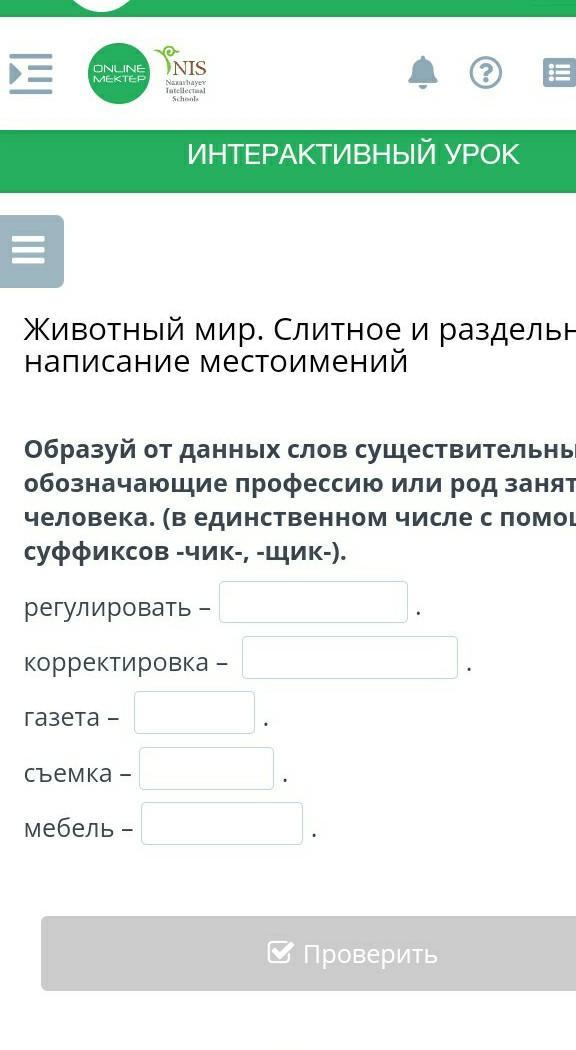 Животный мир. Слитное и раздельное написание местоимений Образуй от данных слов существительные, обозначающие профессию или род занятий человека. (в единственном числе с помощью суффиксов -чик-, -щик-). регулировать –. корректировка – . газета – . съемка –. мебель –. Назад Проверить .