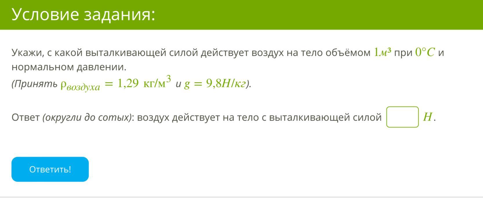 Ответ (округли до сотых): воздух действует на тело с выталкивающей силой Н.