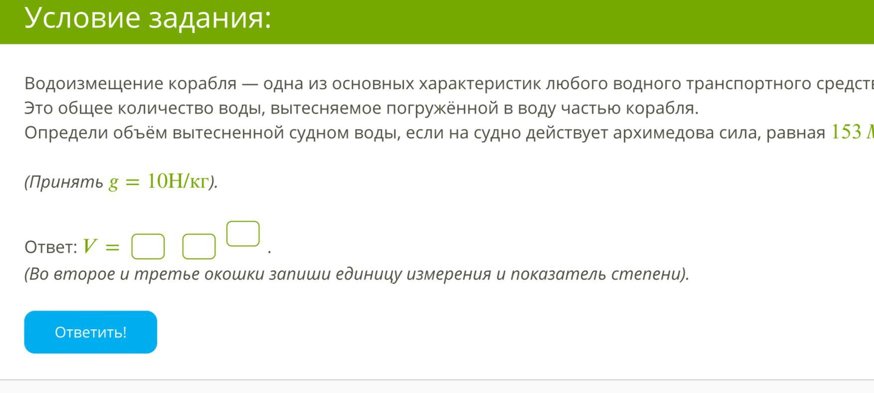 Определи объём вытесненной судном воды, если на судно действует архимедова сила, равная 153 МН.