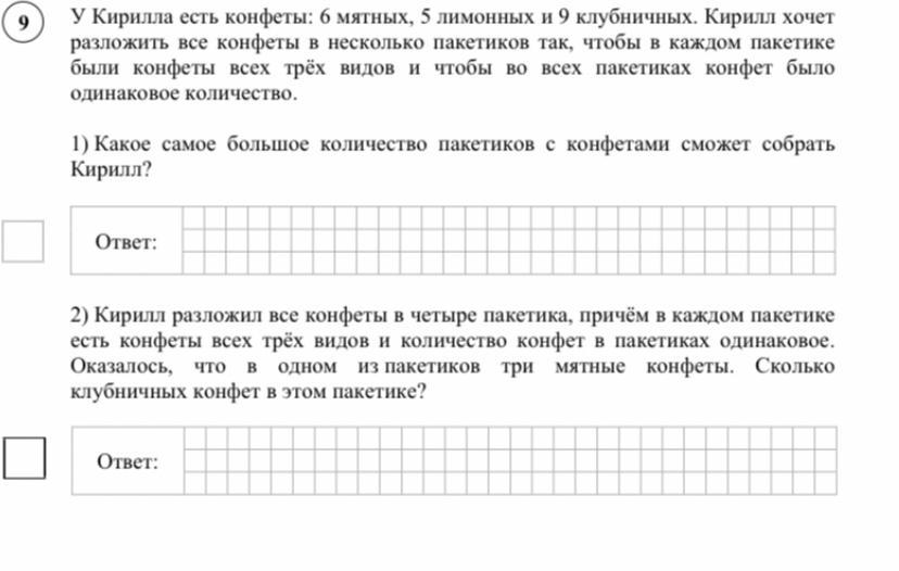 В 1 всего 3 вида конфет, значит пакетов будет тоже 3. Во 2 если сложить все конфеты то будет 20, 20:4=5, 5-3=2 клубничных конфет