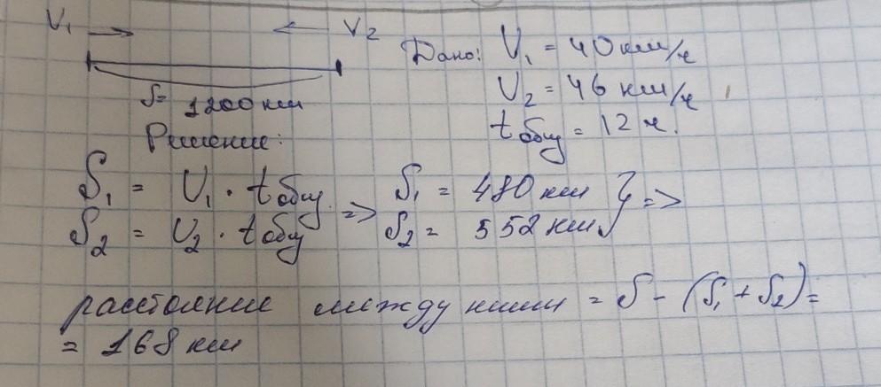 Из двух царств-государств, расстояние между которыми 1200 км, одновременно навстречу друг другу отправились два царевича. Первый скакал на Сивке-Бурке со скоростью 40 км/ч, а второй скакал на Коньке-горбунке на 6 км/ч быстрее, чем первый. Какое расстояние между царевичами будет через половину суток?по действиям обезательно