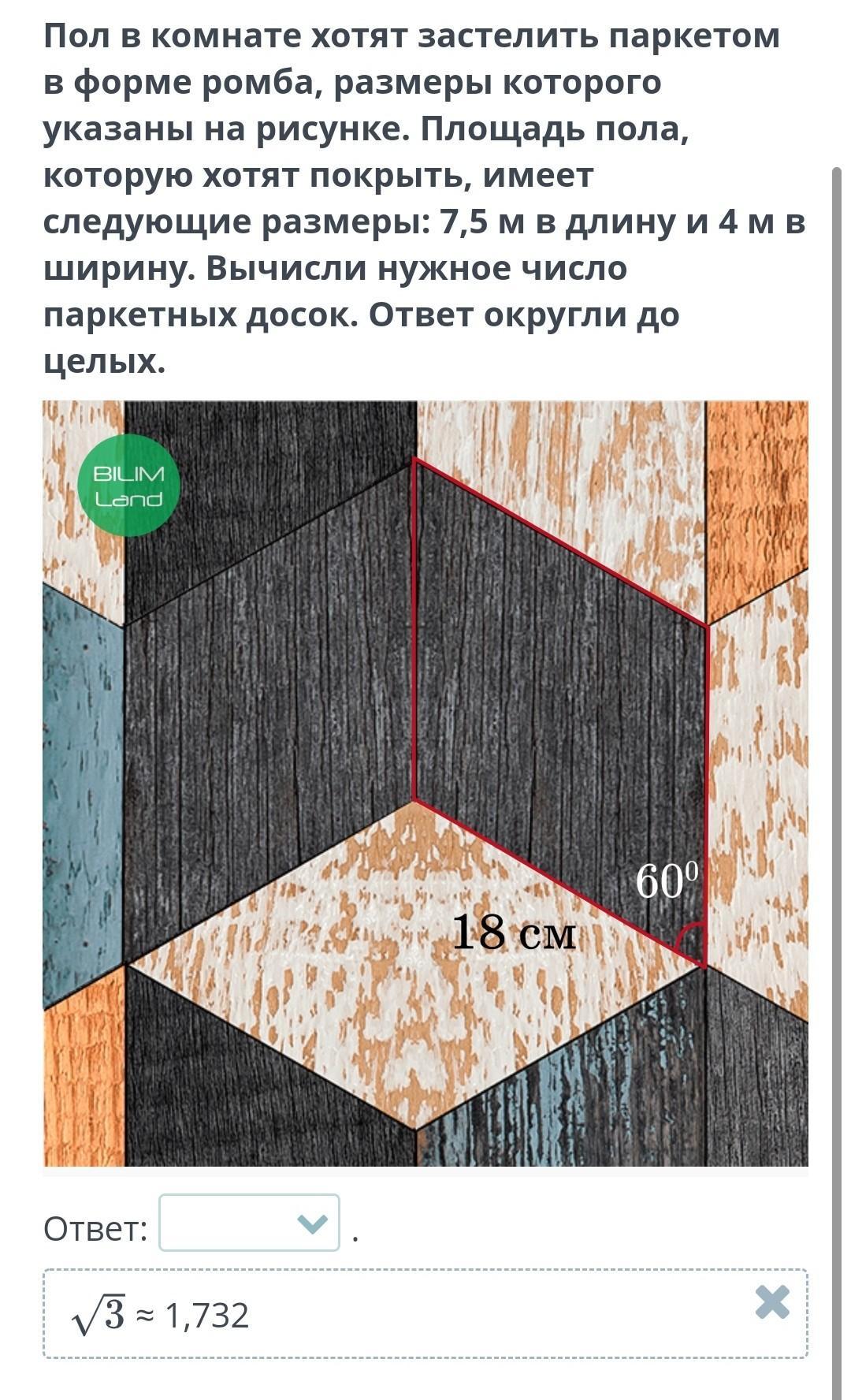 Пол в комнате хотят застелить паркетом в форме ромба, размеры которого указаны на рисунке. Площадь пола, которую хотят покрыть, имеет следующие размеры: 7,5 м в длину и 4 м в ширину. Вычисли нужное число паркетных досок. Ответ округли до целых.