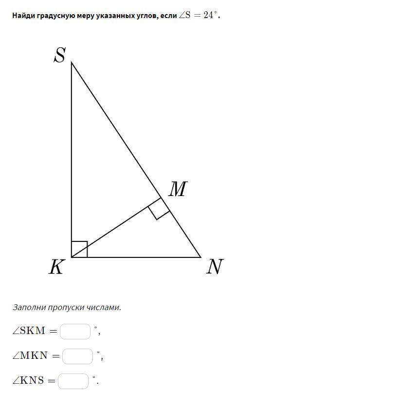 1) Т.к. сумма двух острых углов прямоугольного треугольника равна 90°, то <KNS = 90° - 24° = 66°