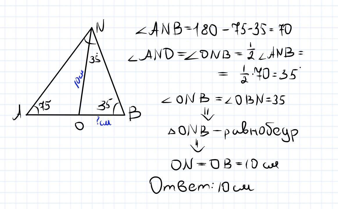 Введите с клавиатуры результат вычислений. В ∆АNВ проведена биссектриса NO. ∠А = 75°, ∠В = 35°, отрезок NО = 10 см, какова длина стороны ОВ?