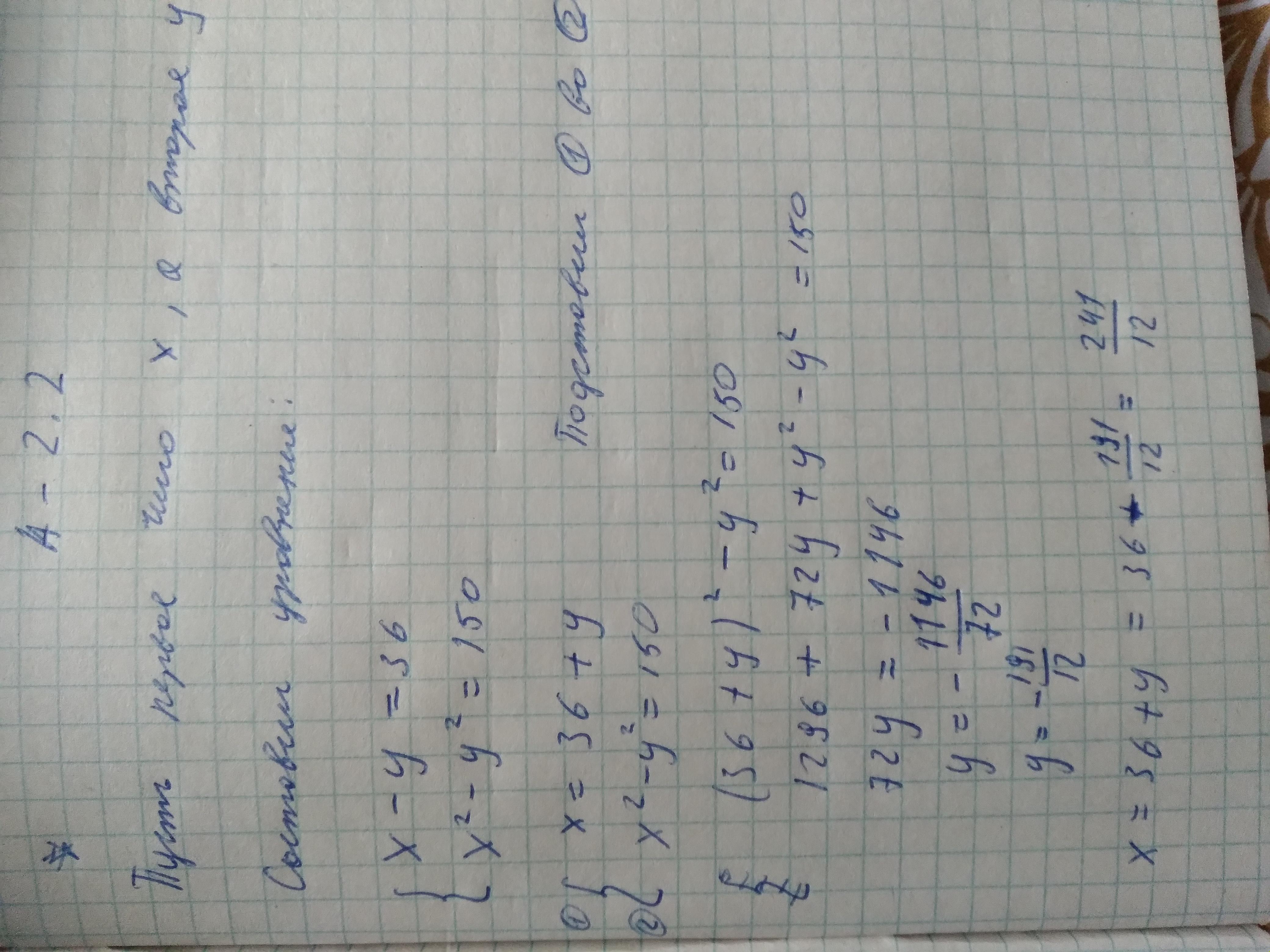 4.Решите задачу в помощью составления уравнения: Разность двух чисел равна 36, а разность их квадратов 150. Найдите эти числа