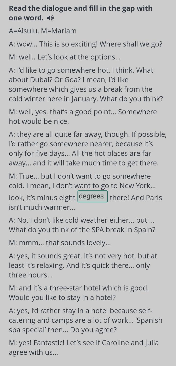 A: I’d like to go somewhere hot, I think. What about Dubai? Or Goa? I mean, I’d like somewhere which gives us a break from the cold winter here in January. What do you think?