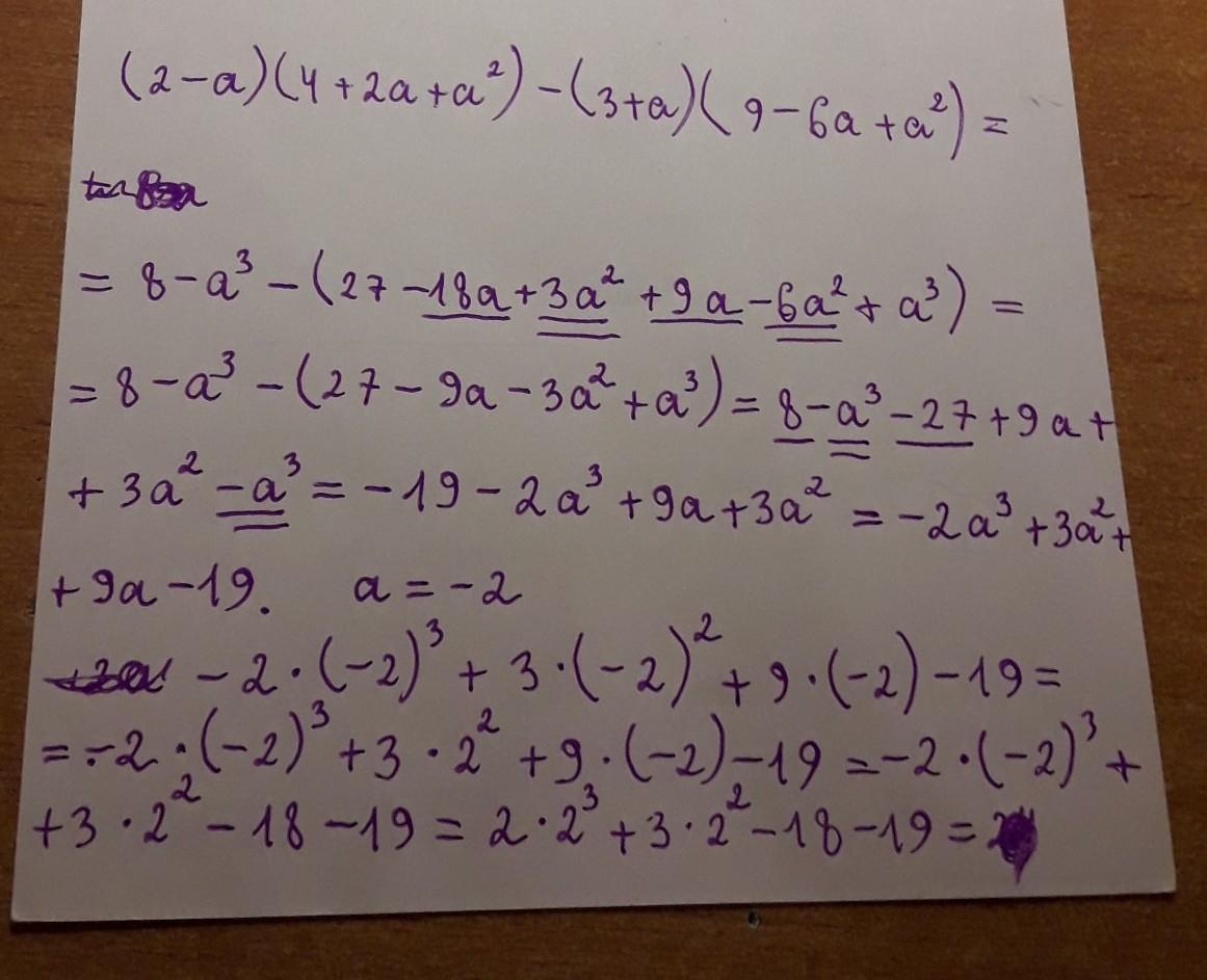 Упростите выражение (2 – а)(4 + 2а +а²) – (3 + а)(9 – 6a+ a²) и найдите его значение при а= -2:
