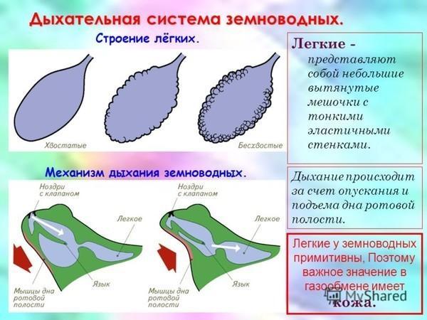 Органы дыхания взрослых земноводных — кожа и лёгкие, у личинок — жабры.
