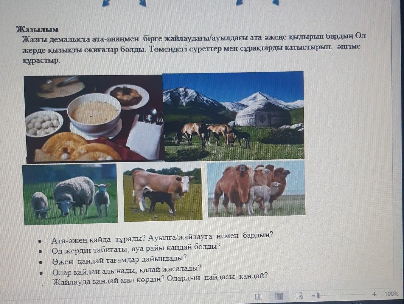 Мен жазда Ата-ажемнин ауылына бардм. Олар Кокшетау турад. Кокшетаудын ауа райы оздернз блетндей суыктау болады, бирак оте керемет табигат. Мен ата ажемнин уйі алыс болгандыктан пойызбен(ұшақпен) бардым. Меніғ әжем ар кун сайын тандырга кызыртып турып нан писиреди. Жане денсаулыкка пайдалы курт, иримшик бир созбен айтканда сут онимдерн жасайды. Ерте турып сут писирип береді. Бул сут онмдері сиыр, ешкі, қой сутинен алынады. Құрт кушты дамди болу ушн ажем оны ешкі сутинен алады. Мен жайлауга барып корген емеспин, бирак тауга барп коргенмн. Ол жерде мен үйір-үйір жылкыларды, койларды коргенмн. Бул жануарлардың пайдасы, ет жасауга болады, сутн ишуге болады, сол суттен курт иримшик сут онимдерн жасауга болады. Туйе, кой жундернен киіз, киім жасауга болады.