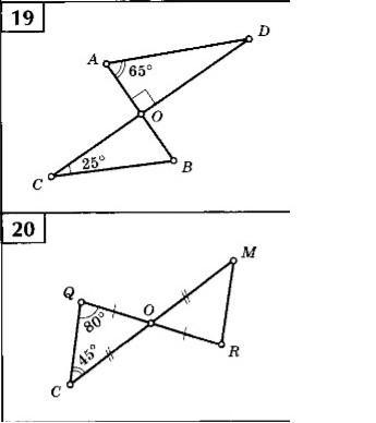20) ΔCQO и ΔMRO равны по двум сторонам (QO=RO и CO=MO по условию) и углу между ними (∠О вертикальный). В равных треугольниках соответственные углы равны: ∠Q=∠B=80°, ∠C=∠M=45°, ∠O=180-(80+45)=55° (сумма углов треугольника).