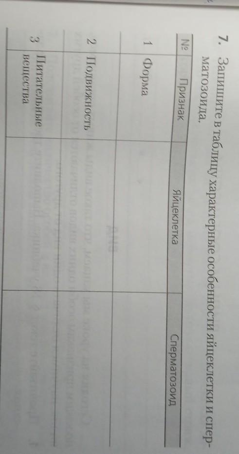7. Запишите в таблицу характерные особенности яйцеклетки и сперматозоида. Таблица - ...