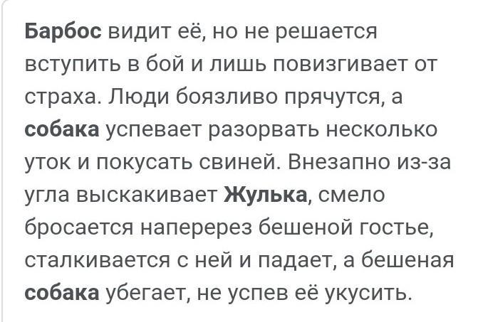 Жулька умирала в сарае после совершенного ею смелого поступка, она кинулась на бешеную собаку, забежавшую к ним во двор. Барбос просился к ней и ему разрешили попрощаться с любимой подружкой. Позже пес вышел из сарая, лег рядом, а затем очень громко и душераздирающе завыл.