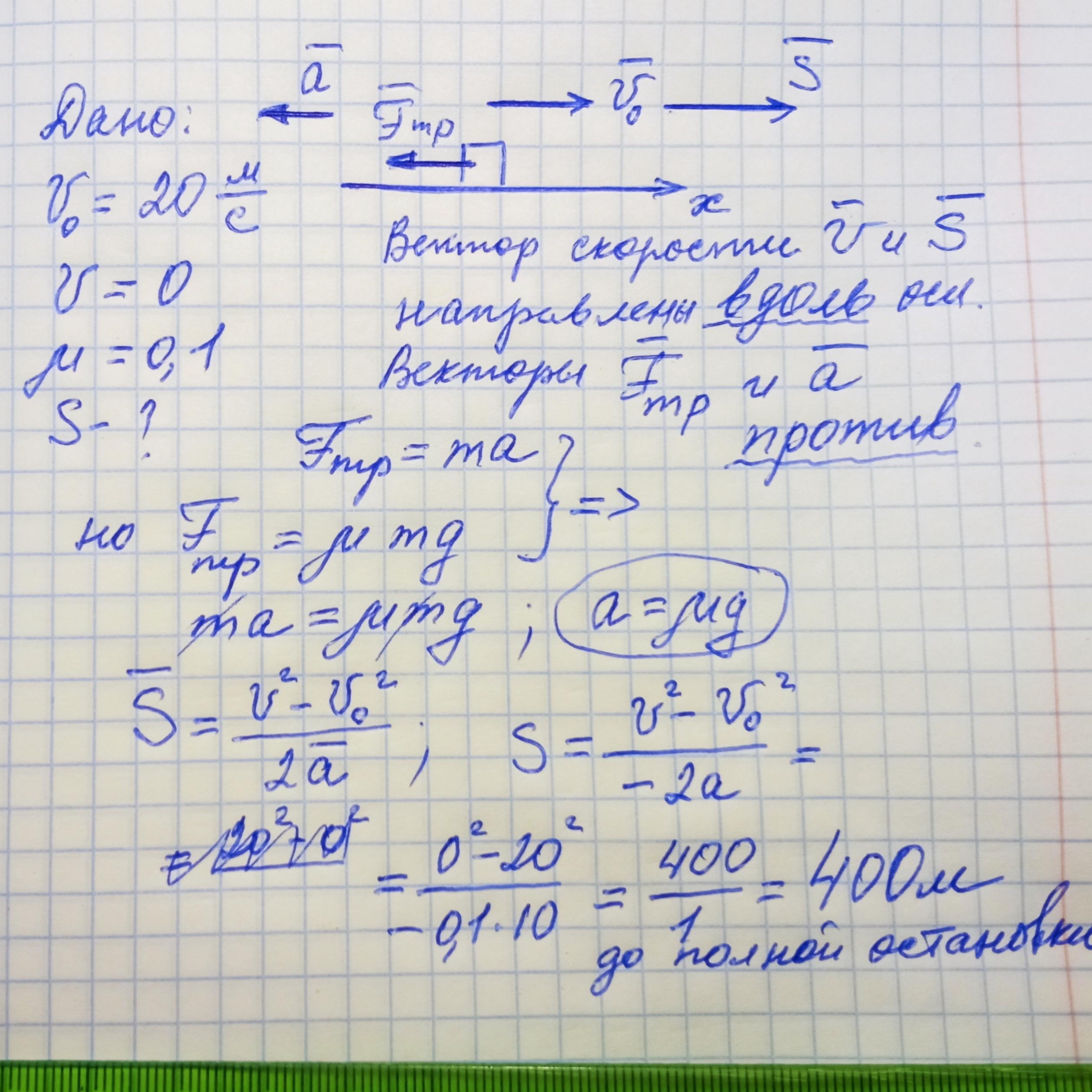 Какой путь пройдет тело, движущееся по горизонтальной плоскости скоростью 20 м/с, после окончания действия силы тяги, если коэффициент трения тела о плоскость 0,1?