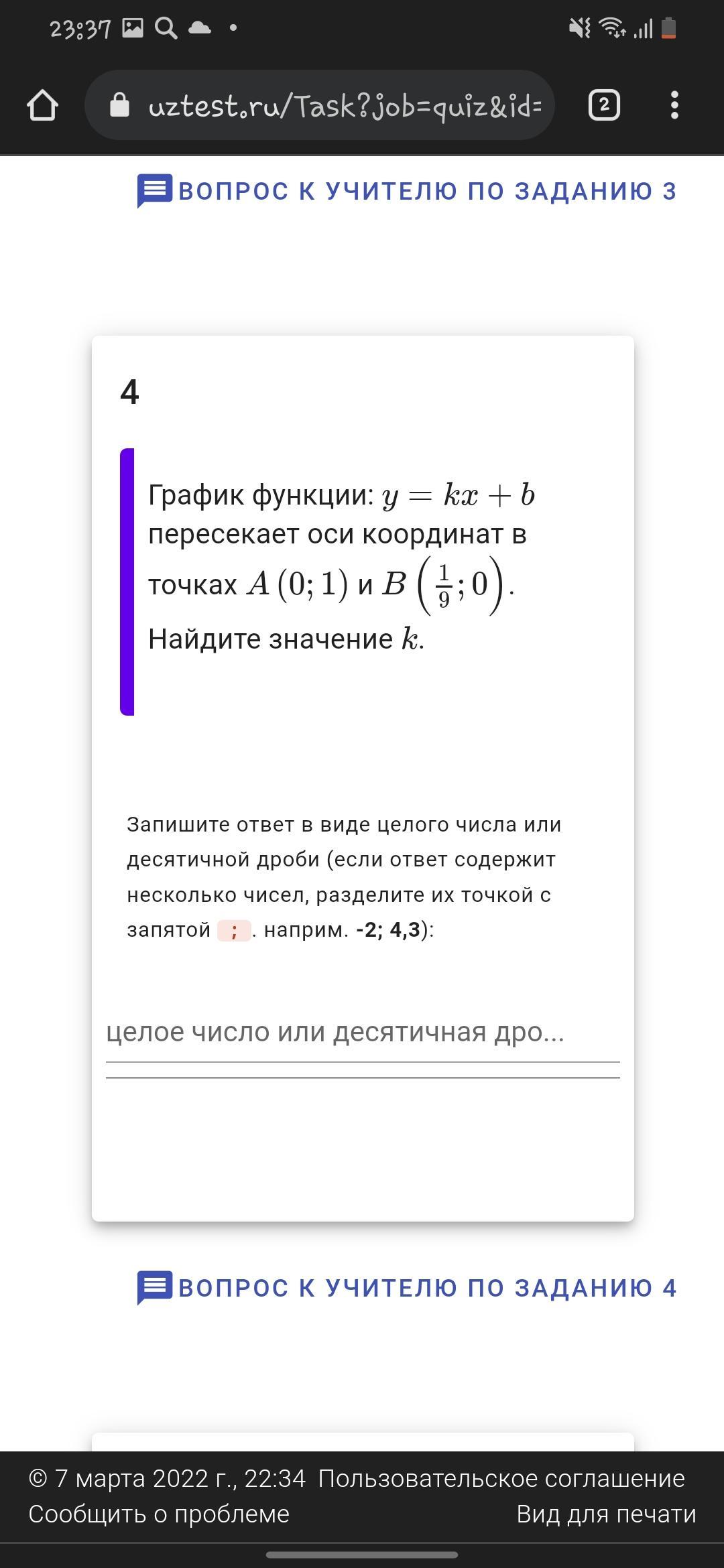 2) Так как график функции y=kx+b пересекает оси координат в точках А(0;1) и В(1/9;0) , то, подставив координаты точек в уравнение, получим верные равенства: