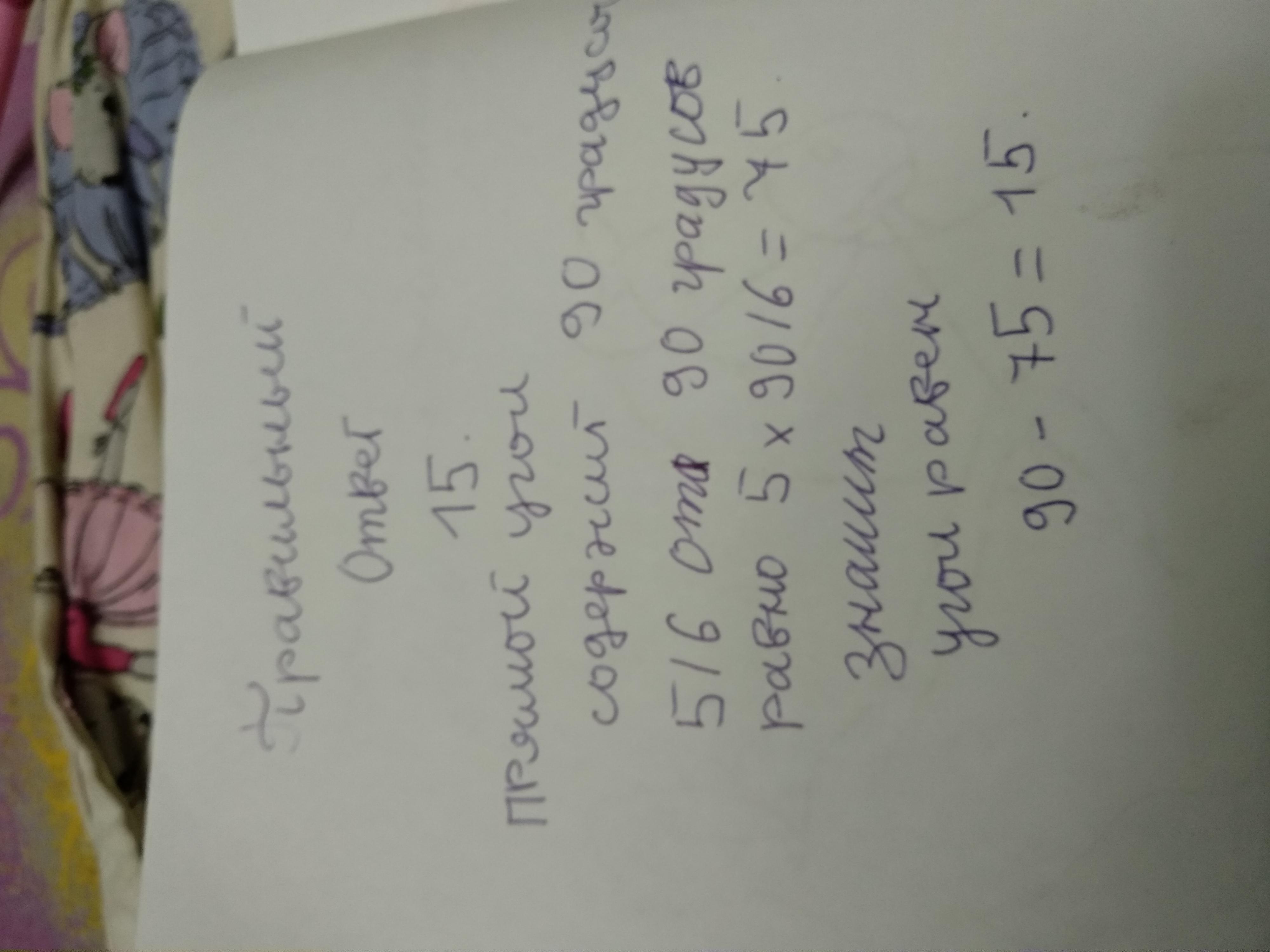 прямой угол содержит 90°, 5/6 от 90° равно 5*90°/6=75°, значит, искомый угол равен 90°-75°=15°