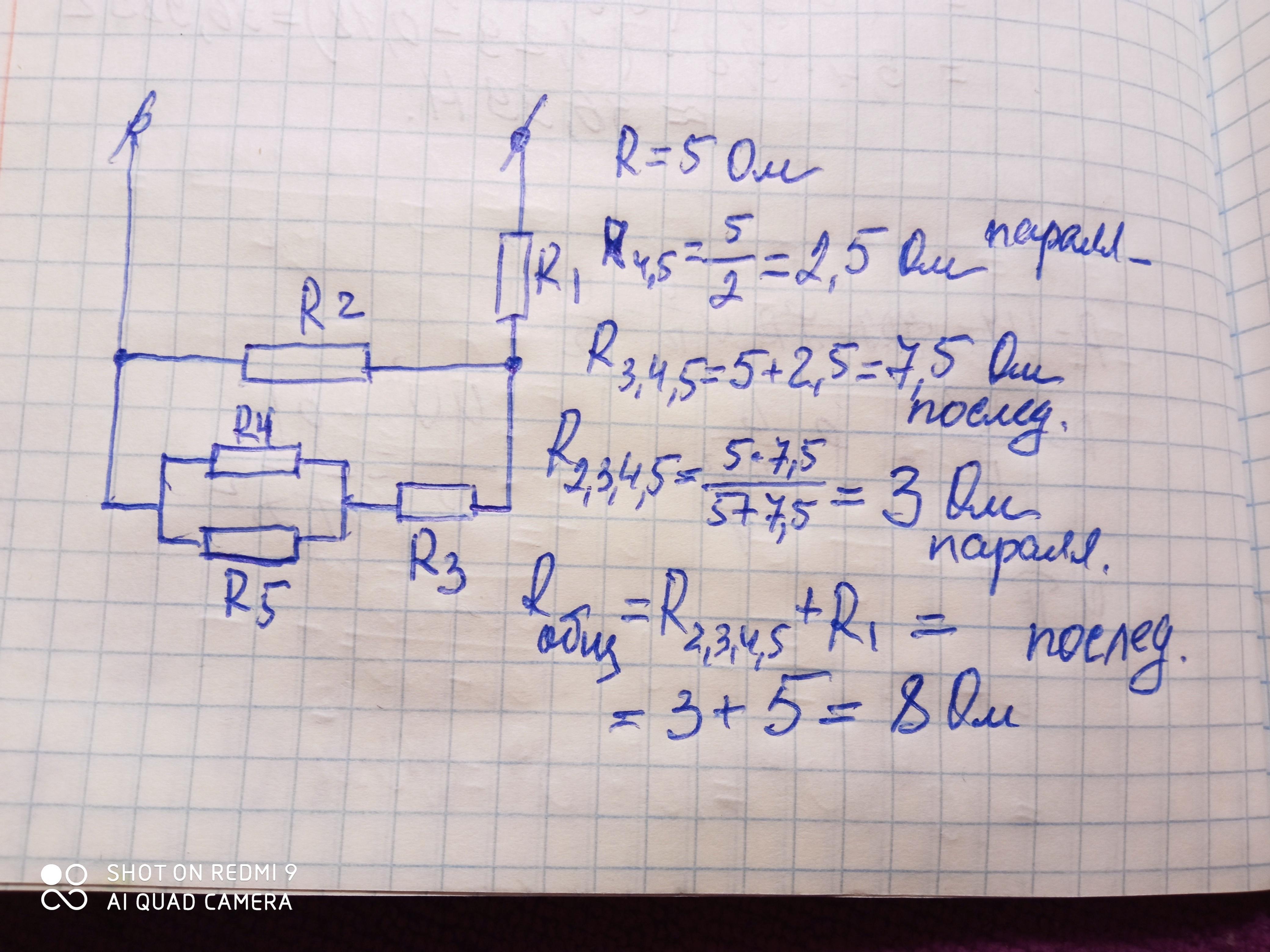 Rобщ = R₁ + R₂₃₄₅ = 5 + 3 = 8 Ом